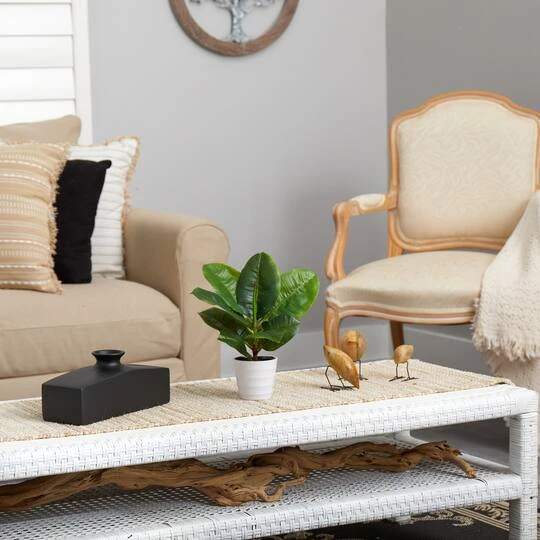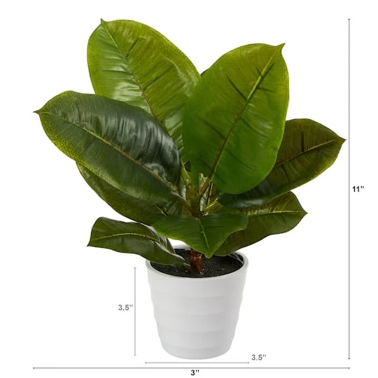 Delight at the sight of a green fountain with this Rubber Leaf Artificial Plant. Thick leaves turn up the heat, bringing jungle vibes wherever displayed, delivering lush green foliage. If you’re a fan of the Fiddle Leaf Fig — this faux plant is the less famous cousin but just as nice, maybe, one day — it can become the next “it” plant. Standing 11″ tall from a white planter, this fake plant is perfect for any desktop.