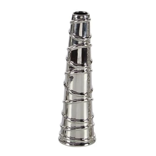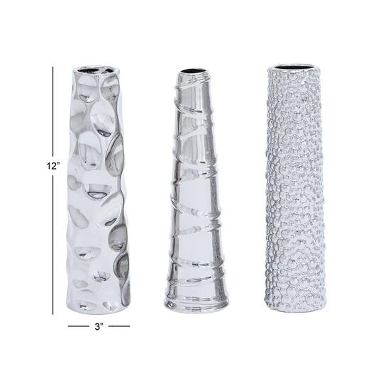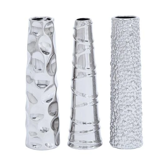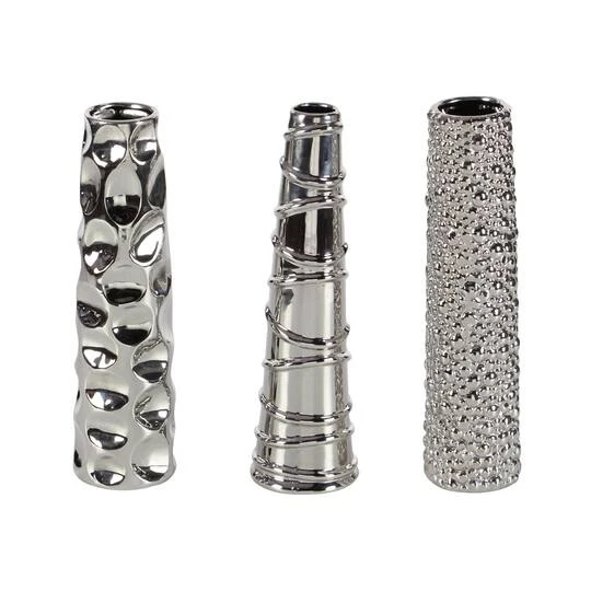The modern vibe of this polished silver ceramic vase set will definitely be a hit in your glam home. The unique individual designs of these ceramic vases range from a ribbed design, geometric, and pebble textured finishes. The polished silver finish further emphasizes these details. Place this on tables or shelves and stir curiosity in your glam living space.