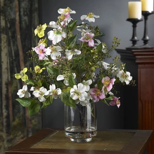 Welcome spring with open arms when you display this beautiful Dogwood arrangement. Bursting with soft, pastel colors, the delicate flowers provide the perfect cure for the winter blues. Wispy stalks with green leaves and tiny buds complete a look that will certainly freshen up any home or office. Complete with a glass vase and liquid illusion, this arrangement is sure to please.