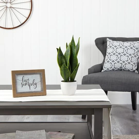 Shh… no one will know your secret with this artificial snake plant. Bring vertical foliage to your space with the snake plant’s sword-like leaves, maintenance-free. Standing 16″ tall from a planter, add this faux snake plant to compact spaces like awkward corners, home offices, bathrooms and bedrooms.