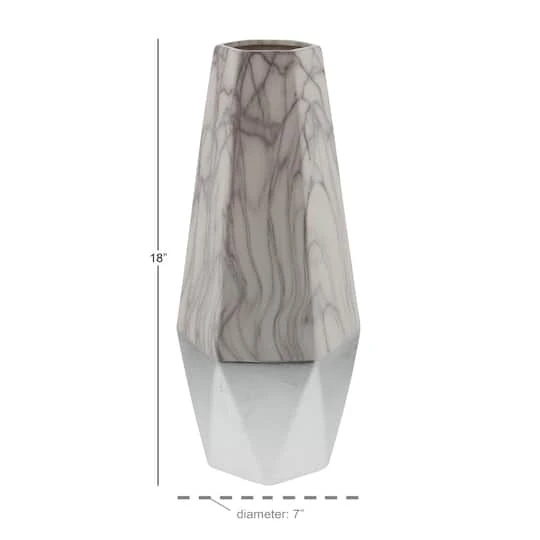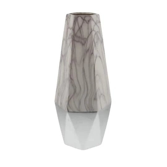 Add eclectic contemporary style to your space with this large marble vase with angled geometric cuts. The defined silhouette tapers throughout and features a hexagon-shaped opening. This white, gray, and silver vase is perfect for displaying tall vase filler and twigs, as well as filling up any negative space against an empty wall. The versatile hues work wonderfully with any color palette while adding texture and sophisticated style to the bedroom, dining room, living room, or office.