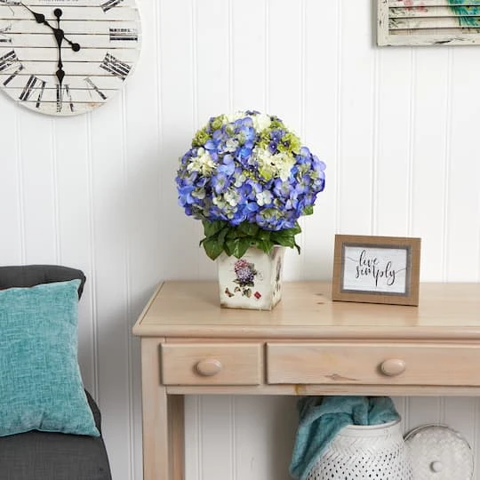 Bright, cheerful and perfect for any occasion, this mixed hydrangea arrangement possesses vivid gorgeous, multi-colored blooms that are sure to please. The pretty flowers are arranged with in a large encasement of bright green leaves and a sumptuous floral planter that is detailed with cheery garden designs.