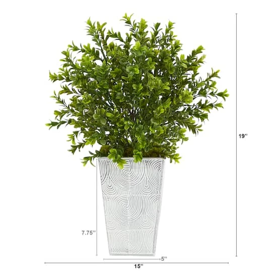 Brighten tight spaces with this artificial plant boasting an overgrowth of boxwood foliage designed with UV resistance to display it either indoors or outside without fearing damage from the natural elements. Stands 19” high from an embossed white planter.