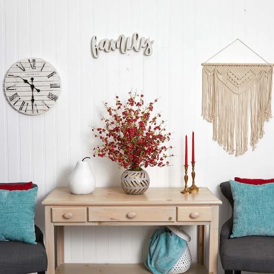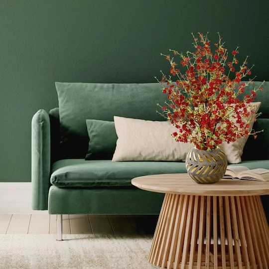 Incorporate hints of the countryside throughout your home with this cheerful, artificial arrangement flaunting a delicate collection of cherry blossom sprays, each made up of intricate silk flowers in bright, fresh color and enhanced with complementary greenery. Standing 30″ high from a gold trimmed stoneware vase, this effortless arrangement would easily beautify a bedroom or bathroom.