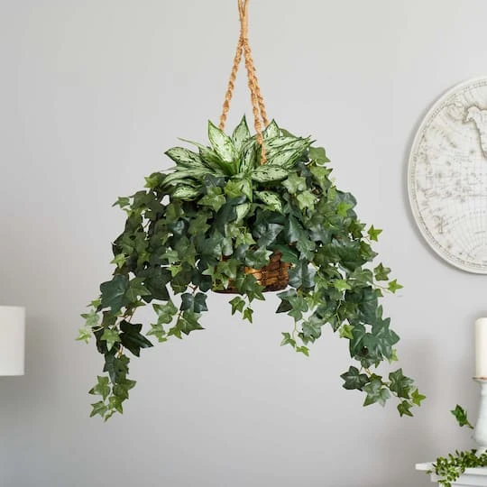 This 2.5ft. artificial silver queen and ivy plant features densely packed variegated green leaves sitting atop lustrous leaves that cascade down and out of the woven hanging basket. It’s the perfect ornament to decorate a blank wall or fill airspace with a bold and vibrant statement. Hang this by a window to display its realistic beauty in the natural light. Measurements are from the bottom of the pot to the furthest extended leaf or branch.