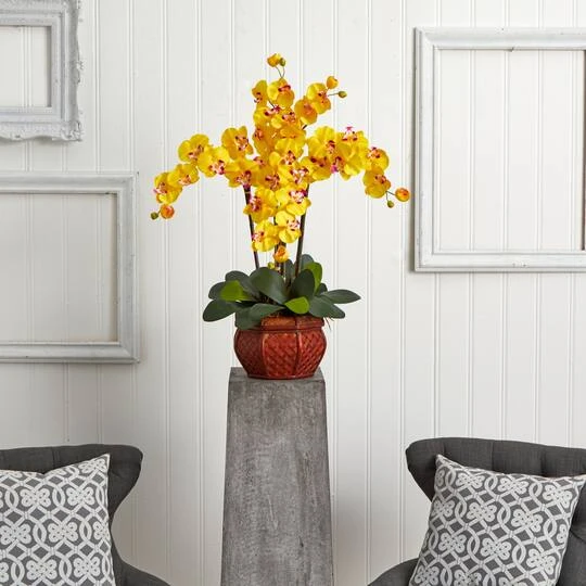This 31″ high moth orchid resembles a miniature tree thus enhancing its already delicate look. Set atop a bed of green and a tasteful island inspired vase, this delicate looking flower lasts forever with no watering ever!