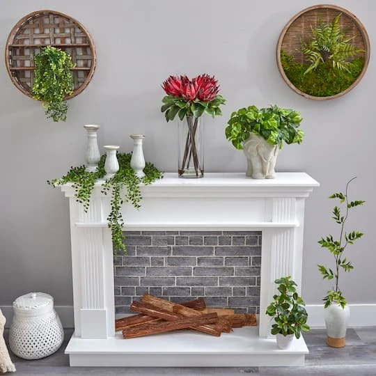 Large red blooms with white and black variegated spikey edges are contrasted by dark, green leaves, creating green foliage. The thick, brown stems soften the look by bringing subtle color. Standing 22″ from a glass vase with faux water, add this arrangement to a space in need of some life. Create drama in spaces like offices, bedrooms, bathrooms, kitchens or living rooms.