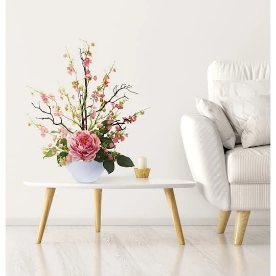 A single, highly-detailed big flower dominates the center of this rose and cherry blossom artificial arrangement. It sits on a cushion of realistic dark green leaves. The delicate, thin stems intertwined with the tiny blooms create a beautiful backdrop to this majestic ornament. At a height of 23″, it will stand out above your entryway table or neutral-toned mantelpiece. Place it together with your picture frame and wall clock for a chic finish.