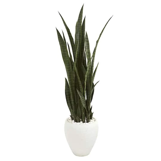 Dense leaves grow tall in this artificial replica of the sansevieria plant. This dignified succulent shows off amazing life-like qualities from authentic coloration to dark, pointed leaves. Nestled among natural-toned rocks in a white textured planter, it adds an instant touch of natural beauty.