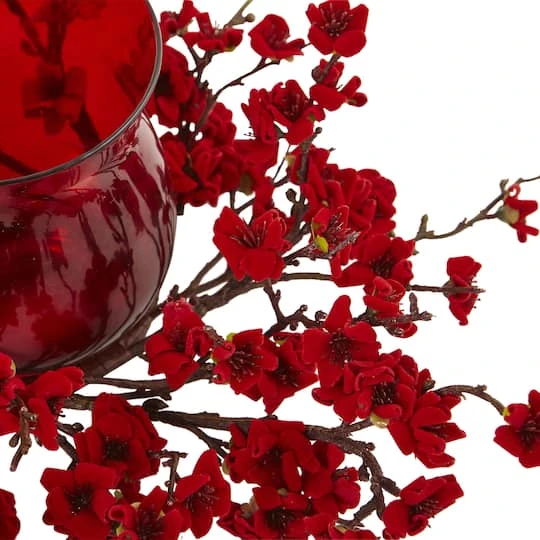 Delight your guests with this lovely candelabrum on your dinner table, mantle, or anywhere else. Its soft plum blossom color is just the right shade of red, and the delicate blooms that top the delightfully twiggy stems are simply perfect. Rounding out this look is a glass candle holder. Perfect for decorating, this piece also makes a treasured gift.