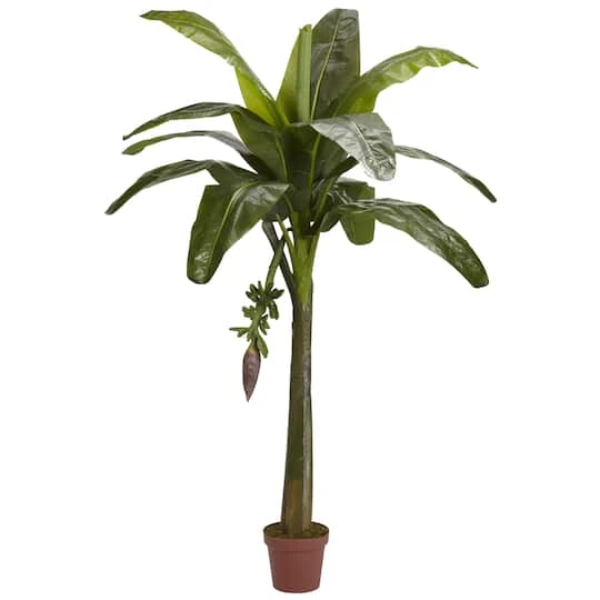 Break out the beach towel and dream of your own tropical paradise under your very own banana tree. Realistically-designed sturdy double trunks hold numerous large leafy vibrant green leaves up high. As a finishing touch, tiny sprouting green bananas are included to complete the illusion. Standing in a decorative pot, this tree is perfect for those wanting something just a bit different.