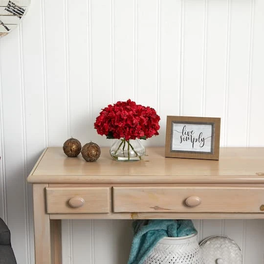 Rich, vibrant shades of red spillover petite stems to form this hydrangea arrangement. Vivid, red hydrangea petals constructed of beautiful materials mirror that of a genuine hydrangea plant. Placed in a liquid illusion vase, this arrangement is the perfect accent piece for a holiday centerpiece or coffee table vignette.