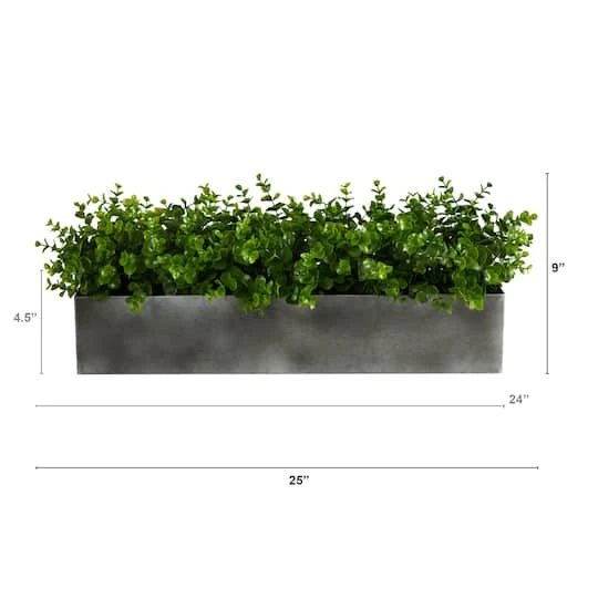 Add a horizontal touch of green to your living areas with this Eucalyptus Artificial Plant. Lifelike, green Eucalyptus leaves are housed together in a decorative planter for a crisp, clean look. If you’re looking to update your office, look no further. This faux plant brings an elevated and sophisticated look that requires zero maintenance or upkeep, allowing you to focus on what matters. Measures 25″ in width and 9″ in height from a grey planter, curate in any desktop that needs some greenery.