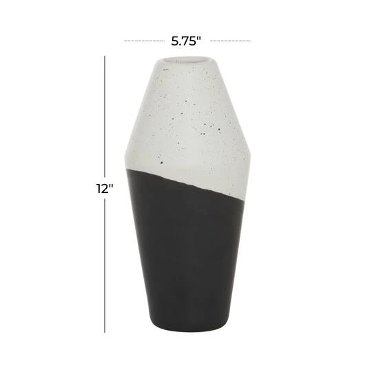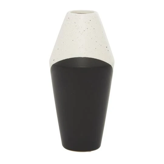 Alone or holding a small bundle of vase filler, this ceramic bottle vase features chic black and white color-blocking over its angled body. The small mouth can display a small bunch of botanicals, but this decorative vase also makes for an eye-catching stand-alone accent decor centerpiece with its bold contrast of diagonal speckled white and solid black-glazed sections. This versatile palette with bold shapes make a cool pattern in modern and contemporary homes and offices. Due to the handmade nature of this item, no two will be alike, there will be slight differences in shape, size, and color. This item ships in one carton. Suitable for indoor use only. Tapered cylinder vase with medium-sized rim opening. Contemporary design.