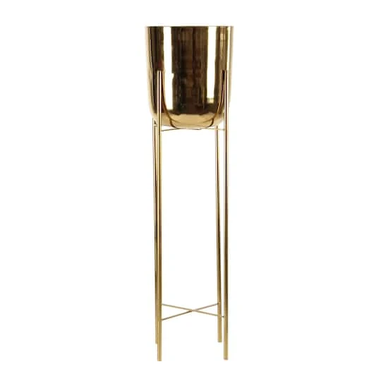 Elevate your plants, literally and figuratively, with this set of 2 large round metallic gold planters on stands. The large round bodies are great for large plants to sturdily sit on the tall metal frames with X-shaped bases. The staggered sizes look chic as a side-by-side set or separate indoor and outdoor for some glam plant looks. Now it’s time to pick out your plants!