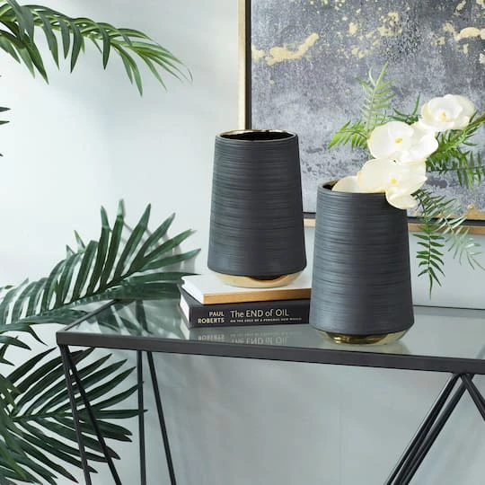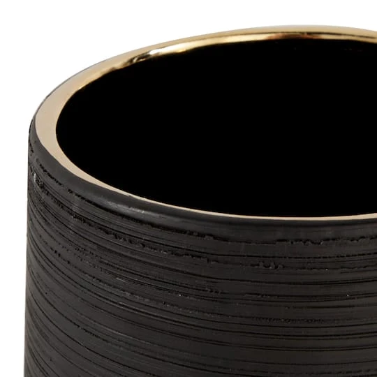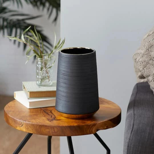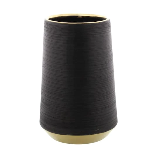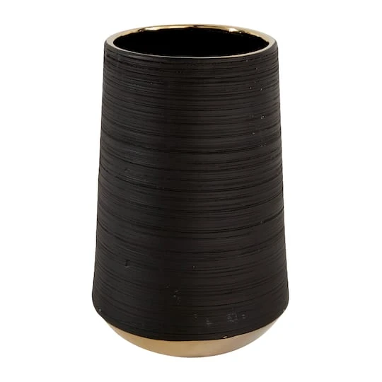 Step up your decor game with this glammed-out black and gold decorative vase, featuring juxtaposing textures and colors. The smooth, shiny, metallic gold rim stylishly contrasts the matte black ridged body with a pear shape that tapers into a 3” matte, natural-colored base. The interior is glazed with a mega-glossy black finish for a sleek look. Designed with black rubber stoppers at the base that prevent scratching furniture and table tops, as well as sliding around. This item ships in one carton. Suitable for indoor use only. Tapered cylinder vase with wide rim opening. Glam Design.