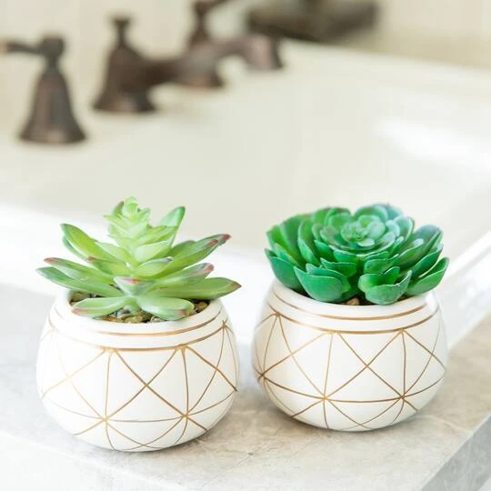Decorate your home or office with this charming set of two geo gold round ceramic succulent planters. They’re perfect for lending your space a naturalistic vibe.