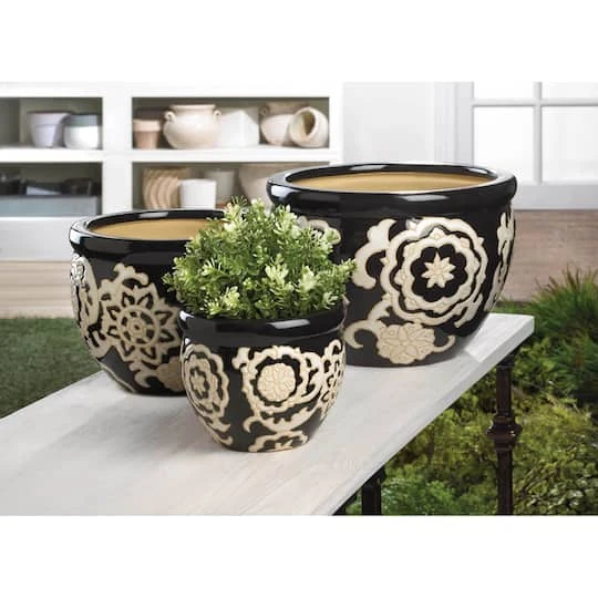 These planters are made of durable ceramic that will beautifully and securely display your flora. These planters are the perfect way to display your favorite flowers, shrubs or trees. Brighten up your garden, patio, sunroom, or interior space with lush greenery and a touch of style! To clean your set of planters, dust lightly or wipe with a damp cloth as needed. These stylishly painted black and white planters add subtle decorative floral flair to the patio or deck. Hole on bottom of each pot allows proper drainage for optimal plant health.