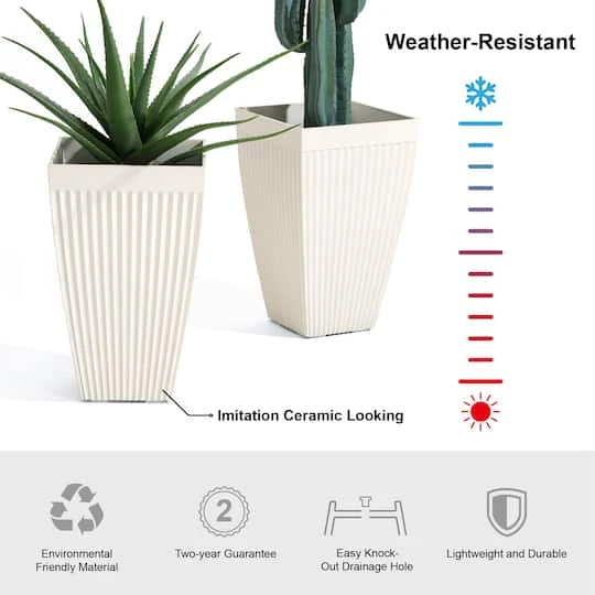 Enhance your indoor or outdoor space with this stylish set of two plastic tapered fluted planters. They’re crafted of 100% recyclable PE and stone mixture, which is eco-friendly and safe. Compared with traditional planters, they’re lightweight, chip-resistant, more durable and with sturdy UV protected structure, ideally for all year around.