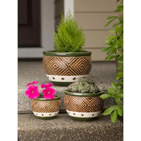 Made of durable ceramic that will beautifully and securely display your flora. These planters are the perfect way to display your favorite flowers, shrubs or trees. Brighten up your garden, patio, sunroom, or interior space with lush greenery and a touch of style! To clean your set of planters, dust lightly or wipe with a damp cloth as needed. Lush shades of sand and jade add natural elegance to your favorite plants, showing them off to stunning effect! Coordinating pots in three separate sizes create an effortless designer look. The bottom of each planter features a small drain hole to ensure your plant stays happy and healthy.