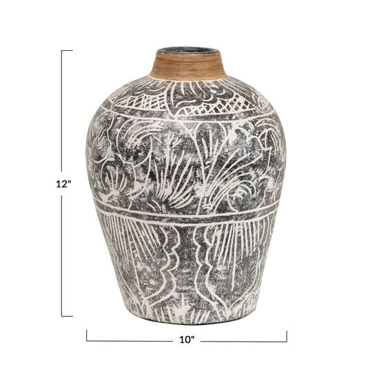 This vase is the perfect unique piece for any table top. Hand painted, this terracotta vase features a beautiful black and white pattern with a banana leaf trim. This vase easily anchors entryways, nightstands, or dressers. Fill with fresh or faux florals for an easy decoration