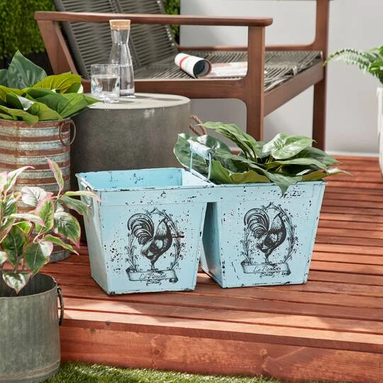 The distressed light turquoise finish with decorative chipping brings an authentic antique vintage feel to your garden area, patio, or indoor space. The calming blue hue with detailed illustrations of roosters and “Le Poulet” cursive script on a banner adds an artistic touch. Easily transport indoors and outdoors by the sturdy metal handle in the center.