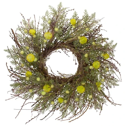 Add a touch of nature to your home with this life-like burr catkin and twig wreath. Layers of soft flower catkin buds green leaves and lime green burrs are placed in a circular design on long twigs. Hang it anywhere in your home or office or use as a centerpiece with your favorite candle in the center.
