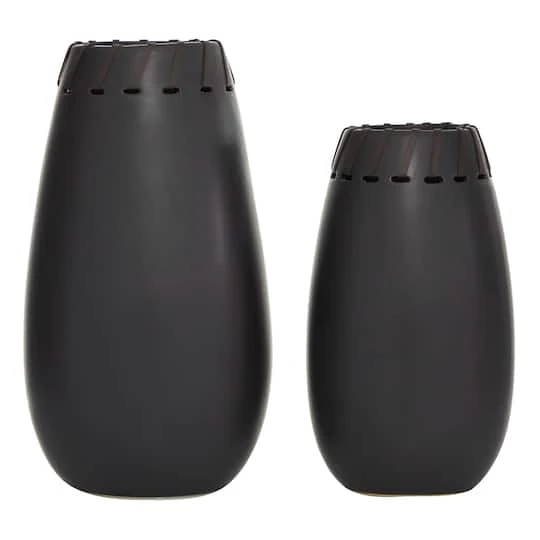 Add a bold punch of modern style to your entryway, living room, or office with this duo of smooth, solid black ceramic vases, featuring leather accents. Each table vase has a rounded silhouette with a large opening speckled with pierced ovals around the rim. Each horizontal oval cutout is woven with a black faux leather strip, adding a unique textural touch to this set of edgy accent decor. Suitable for indoor use only. Vases do not have drainage holes. Set of matte black round vases with circular 4. 80” and 4” mouth openings. Each set comes with 2 matte black round vases. This item comes shipped in one carton.