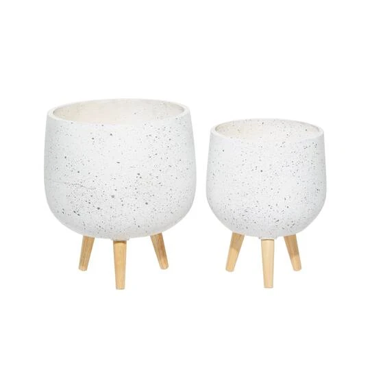 A smart chic style inspired living space knows how important mixing and matching is. especially when it comes to adding some greenery in your space. This cauldron shaped white marble textured fiber clay planter 2-piece set is up for that task. The fiber clay construction of this planter means toughness without sacrificing beauty and elegance thanks to its unique cauldron shaped structure. The entire piece rests on a wooden tripod leg design with circular wooden legs in a light brown hue. This planter set will bring a much-needed freshness with indoor plants in your living room, dining room, home office or entry way. Recommended for use with indoor plants that do not require much water or sunlight, since there is no drainage hole. This item ships in one carton.
