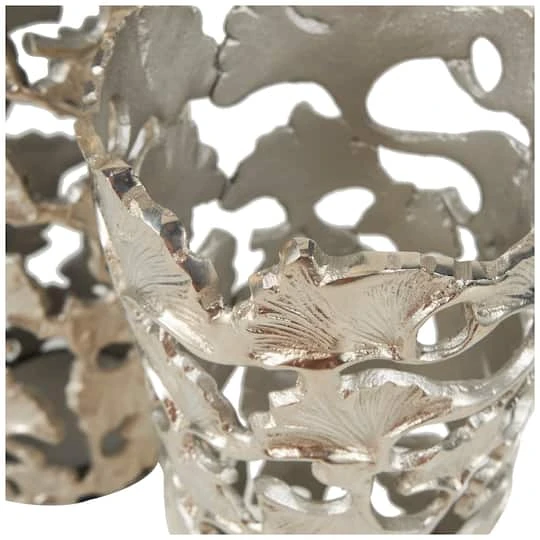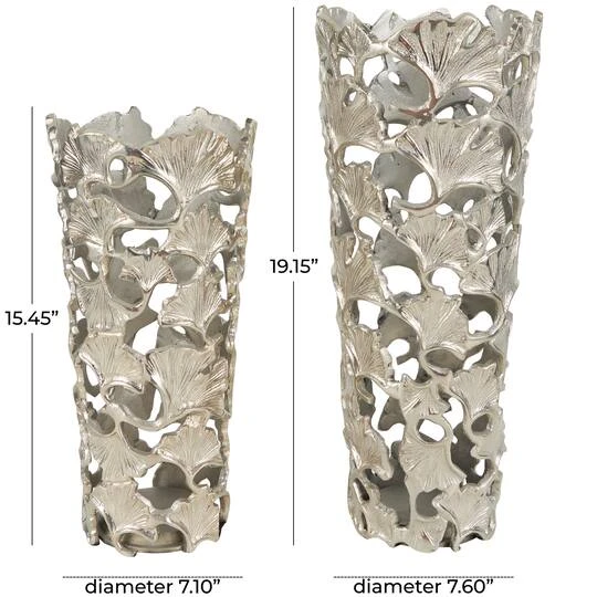 Embrace artistic expression with a style that highlights bold designs with sleek lines, neutral elements, and a minimalist aesthetic. Crafted entirely from high-quality aluminum material, this vase set ensures durability and showcases a lightweight and stylish design. The vase set comes in a contemporary silver color with a sleek and polished finish, adding a touch of modern elegance to any setting. The set of two vases feature an asymmetrical design of gingko leaves with an open frame, adding an artistic and unique touch to their appearance. To use the item, arrange the set of two vases together to create a captivating display or position them separately to accentuate different areas of your home. Designed with felt or rubber stoppers at the base that prevent scratching furniture and table tops, as well as sliding around.