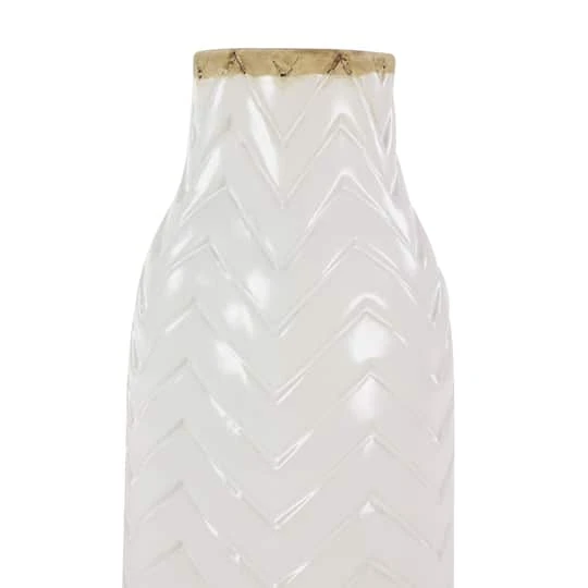 Enrich your coastal or modern space with some subtle movement from this 7″ x 16” round, white ceramic vase, featuring a carved chevron pattern with a white glaze finish. This decorative vase also has a ¾ inch hand-painted, matte light brown stripe at the top and the base, creating a cork look finish. The entire interior is also finished in the semi-glossy, opaque white glaze. This item ships in one carton. Suitable for indoor use only. Tapered cylinder vase with medium-sized rim opening. Coastal design.